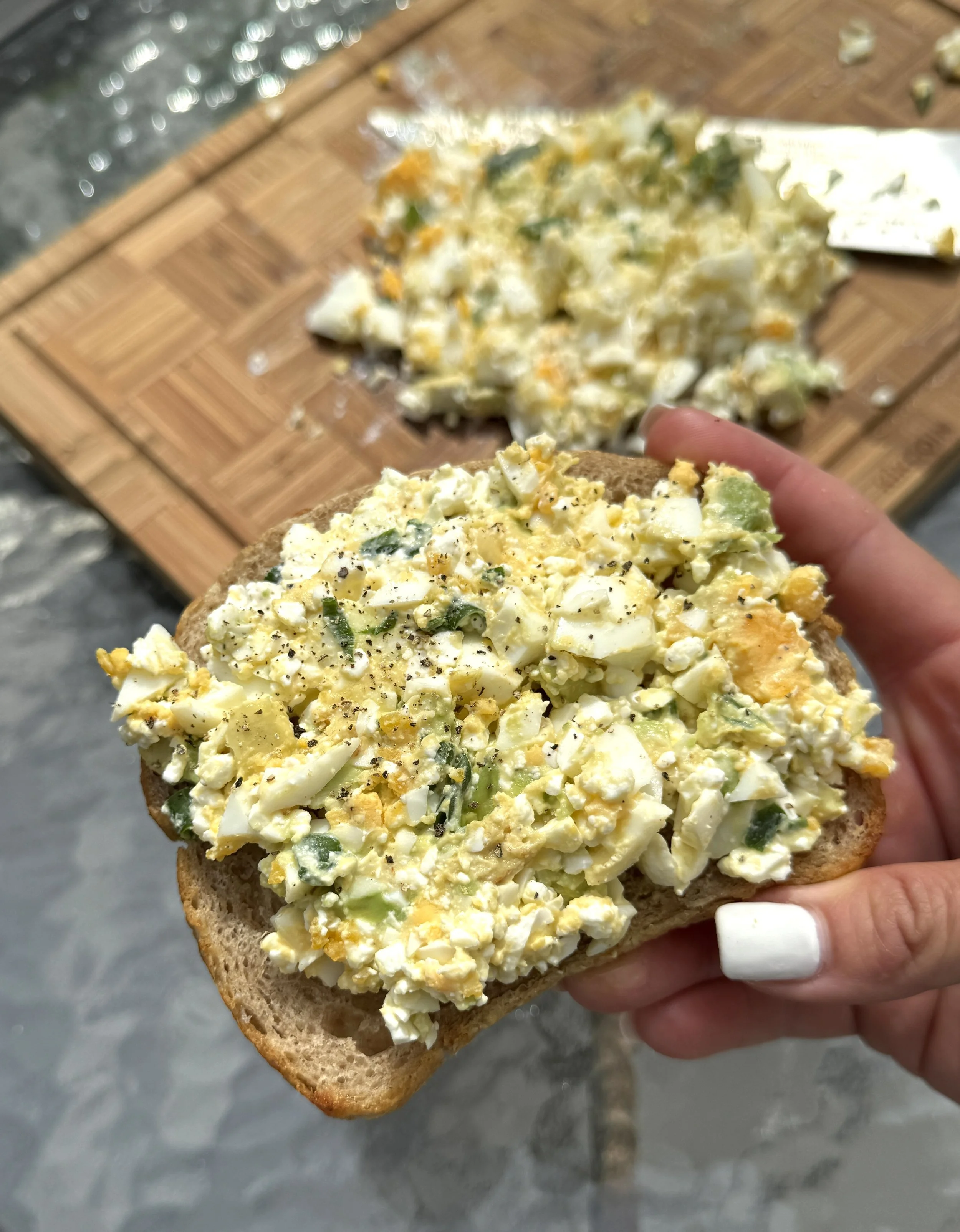 Place peeled eggs, avocado, cottage cheese, and green onion on the board.Chop and mix.
